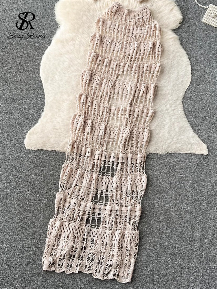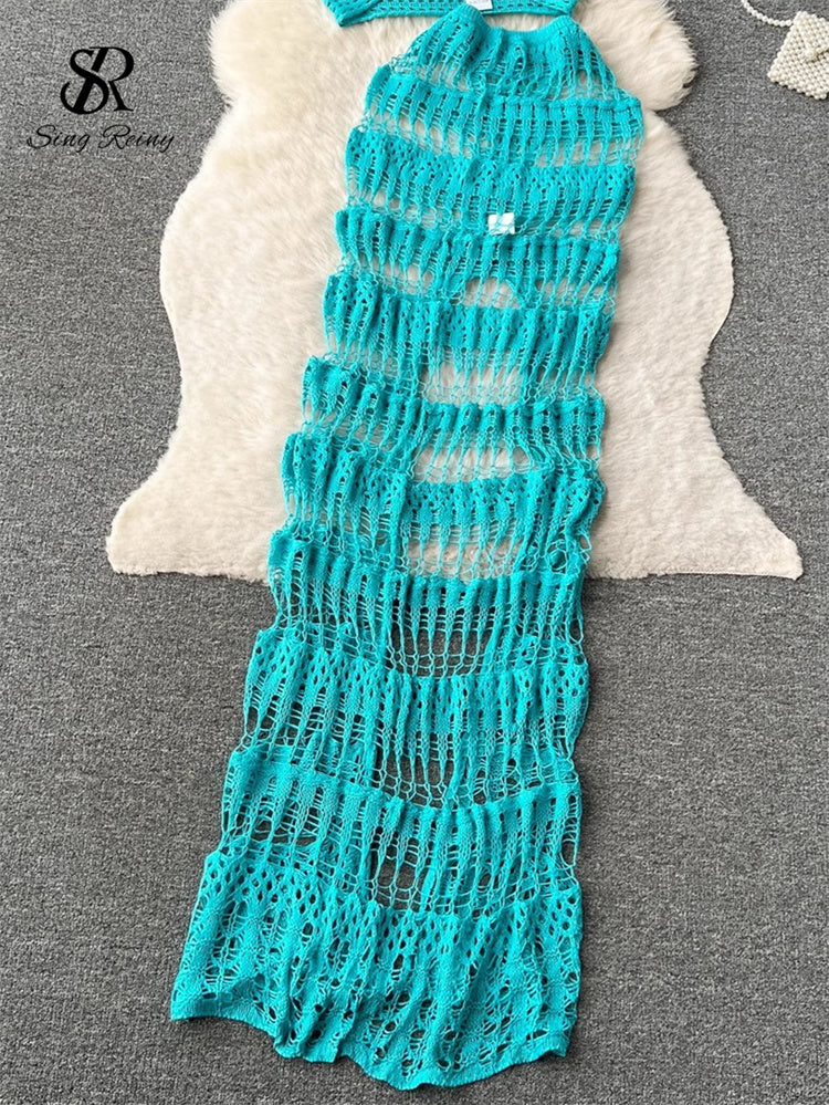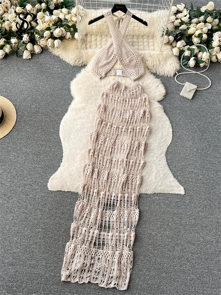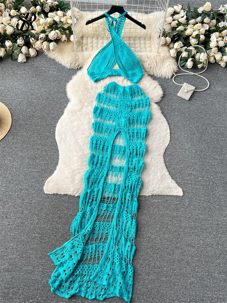 Elevate your vacation wardrobe with the #131 SINGREINY Hollow Out Female Beach Suits. This expertly designed set features a fashionable cross halter camisole paired with a stylish split long skirt, combining Korean-inspired elegance with modern beachwear trends. The hollow-out details provide a subtle, sexy touch while maintaining comfort and breathability, perfect for warm weather. Ideal for ladies seeking a chic yet relaxed look, this versatile set seamlessly transitions from beach days to casual outings.