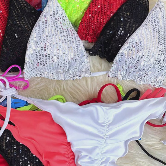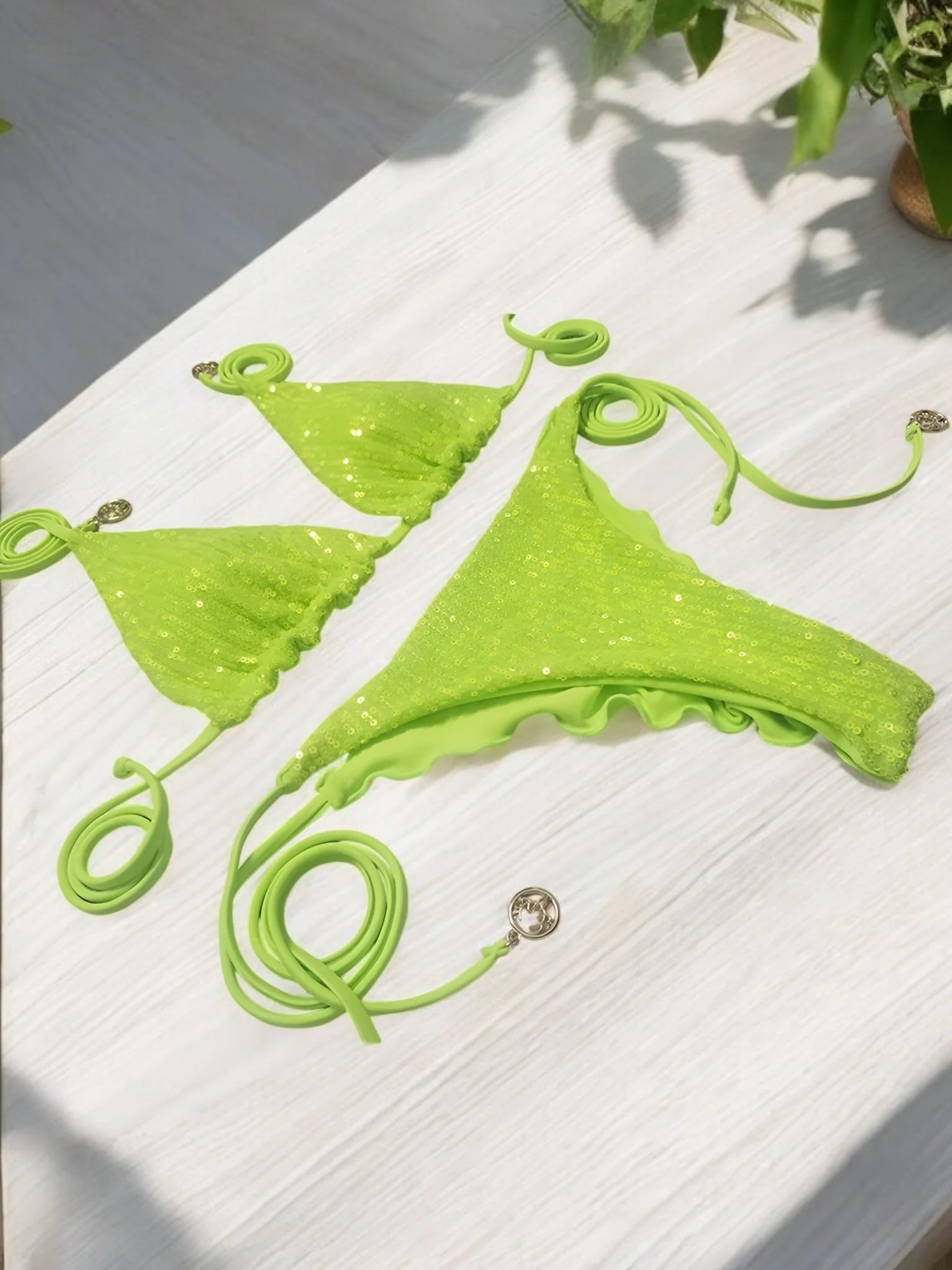 Elevate your beachwear with the #32 Sparkle Waves Brazilian Bikini, a designer two-piece swimsuit crafted for confident women. Inspired by vibrant Brazilian styles, this bikini offers a flattering fit and eye-catching sparkle, perfect for vacations or poolside lounging. Its expertly designed cut enhances your silhouette while providing comfort and style for your swimwear collection.